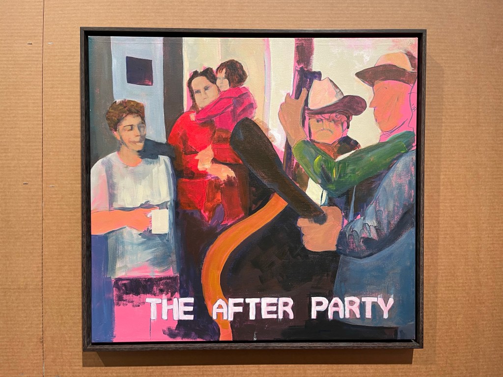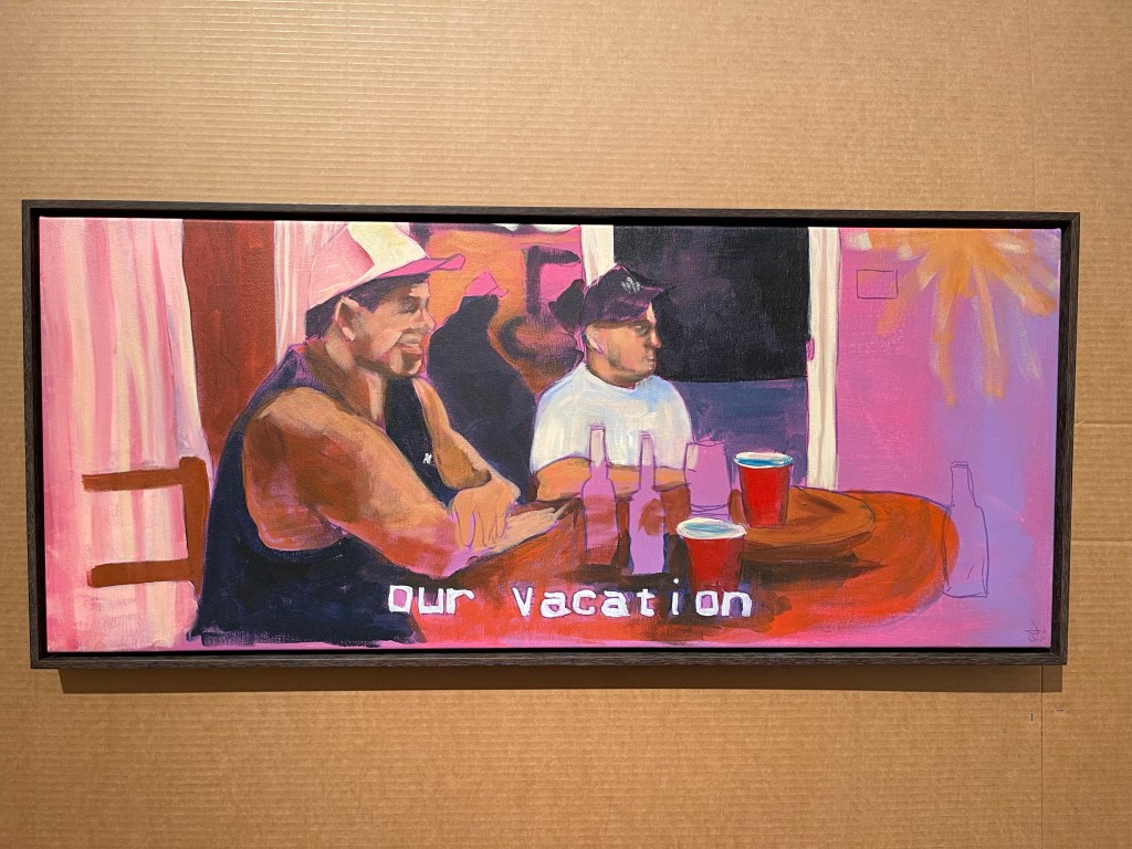 In the series When I Grow Up… I want to be an alcoholic (WIGU…IWTBAA), I explore the feelings of alienation and class struggle using marker and acrylic paint on canvas. This past year, my cousin sent me an array of home movies documented by her mom in the 1990s. In these home movies, the Peralta’s can be seen taking vacations to the lake, celebrating one of the Peralta’s college graduation, and dancing the night away at my Nino’s (godparents) wedding after party. The process for WIGU…IWTBAA reveals the illusions of joy created by the American Dream, the phenomena that had slowly started to deteriorate during the Reagan era. For this series, I first started out by hanging the canvas on a wall to project the home videos onto the canvas. I started my paintings by laying down a base color that is visible underneath the painted layers colors; pink, teal, and light purple. While the home movies were projecting, I found snapshots that I felt most connected with me and my memories growing up and traced them onto the canvas with crayola marker. I was only one year old in most of these videos, I wouldn’t truly remember the events transpiring. The subtitles The After Party, Our Vacation, and Shelley’s Grad ‘98 (not pictured) all speak to the toxic patriarchal values that we are conditioned with throughout our childhoods. The text on the paintings relate everything back to the home movies, a reference to memory only digital video recording can capture. The paintings serve as guidelines for a new perspective on memory and storytelling. In the paintings, there are multiple figures with similar facial features and mannerism which assumes the viewer to think about family systems and hierarchy. In The After Party, my mom is holding me at the door of my nana’s garage where a variety of parties, barbecues, and after-parties were held throughout that span of the previous Peralta generation. Next to my mom is my nana and she’s holding a mug of coffee as we watch the norteños (Northern regional Mexican band) play their instruments to the family. In Our Vacation, my dad and tio Miguel are seated at a table in the lake cabin for the Peralta family summer trip that year. Empty bottles and red solo cups decorate the surface. Not fully rendered glass bottles and discombobulating of space creates a tension that questions the lucidness of the subjects. These were common occurrences I needed to immortalize. Concurrent with those unhealthy activities displayed in the painting series was a consistent drumbeat of education, education, education.