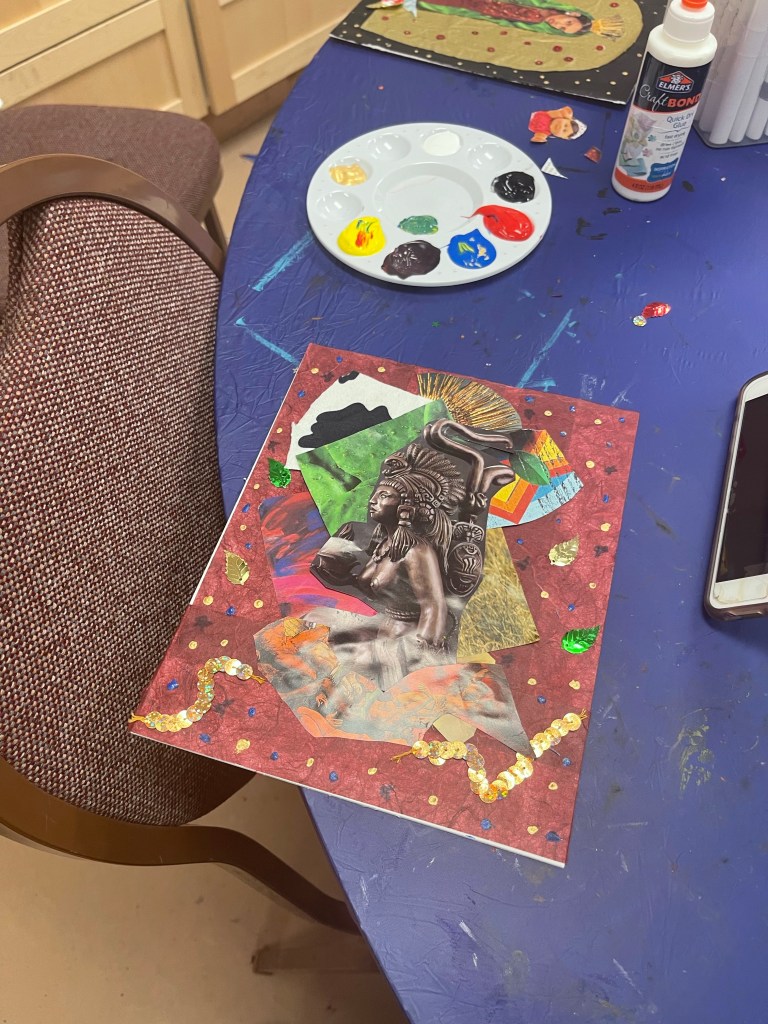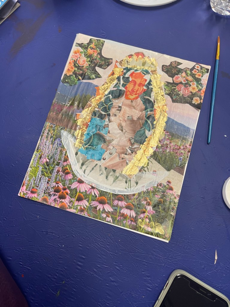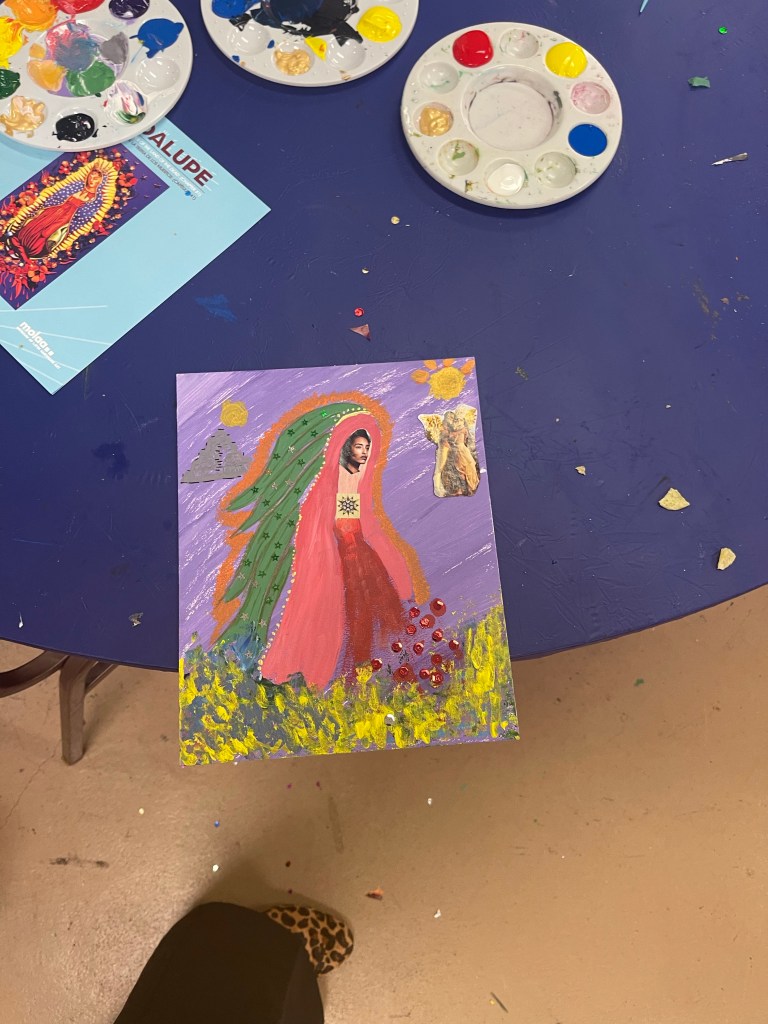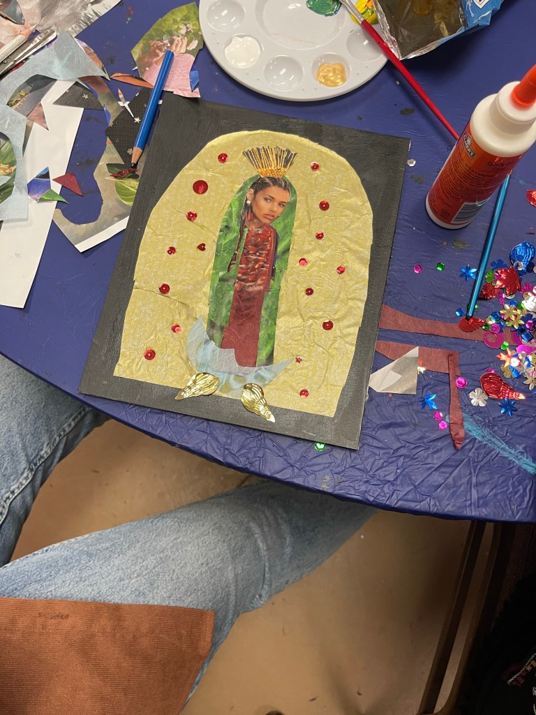 The workshop discussed La Virgen de Guadalupe, a Mexican cultural icon that symbolizes Old World conquest and political liberation. I provided the historical, social, and political landscape through a presentation of slides of the Virgen story and encouraged students to incorporate their personal relationship with the cultural icon to create banners of freedom on mixed media paper with paint, magazine cutouts and black ribbon.
