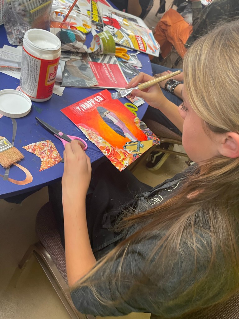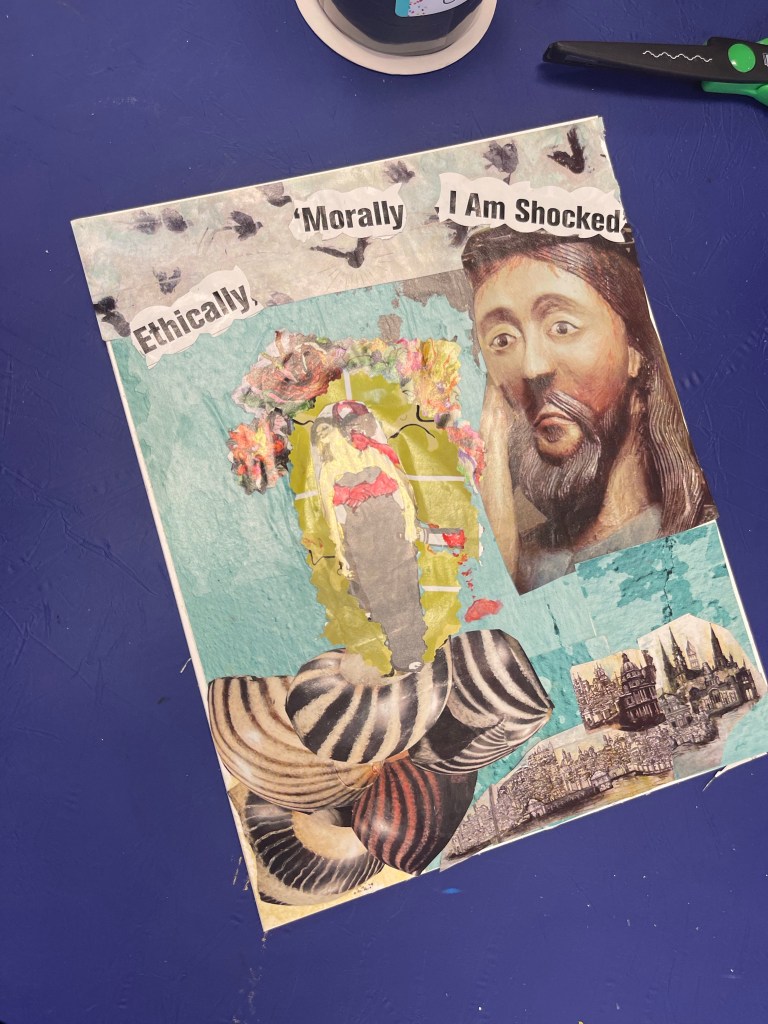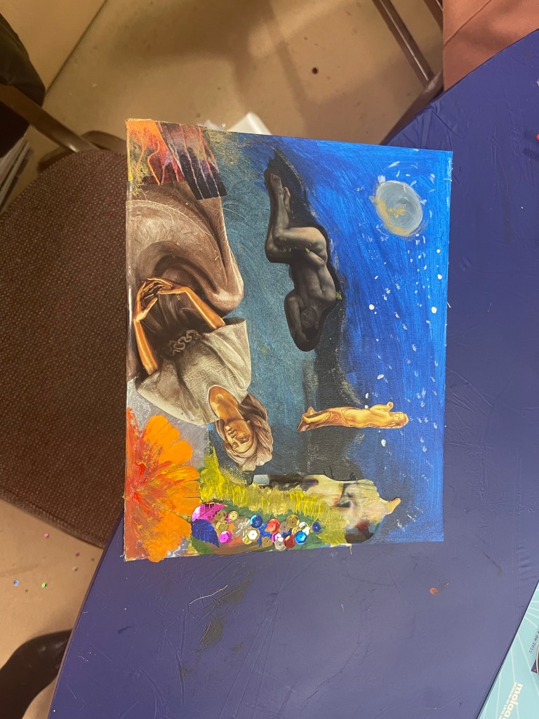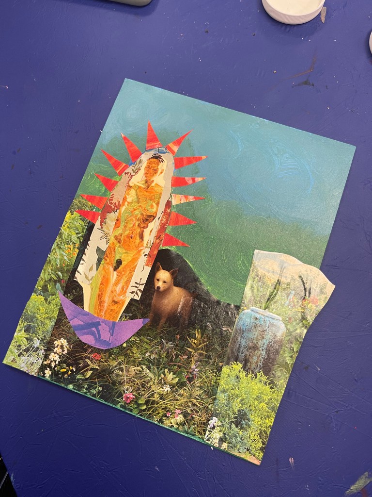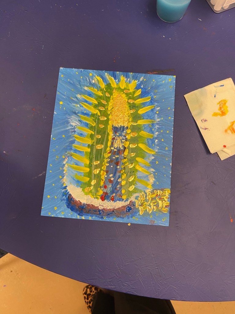 The workshop discussed La Virgen de Guadalupe, a Mexican cultural icon that symbolizes Old World conquest and political liberation. I provided the historical, social, and political landscape through a presentation of slides of the Virgen story and encouraged students to incorporate their personal relationship with the cultural icon to create banners of freedom on mixed media paper with paint, magazine cutouts and black ribbon.